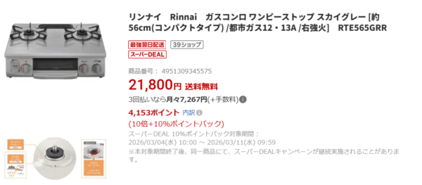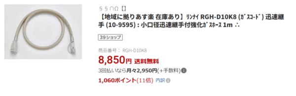 合計で約3万円ほどの出費ですが、引越し当日からガスレンジが使えないと困ると思い、楽天市場でリンナイのガスレンジ本体とガスホースを注文し、無事に引越し前に届きました。